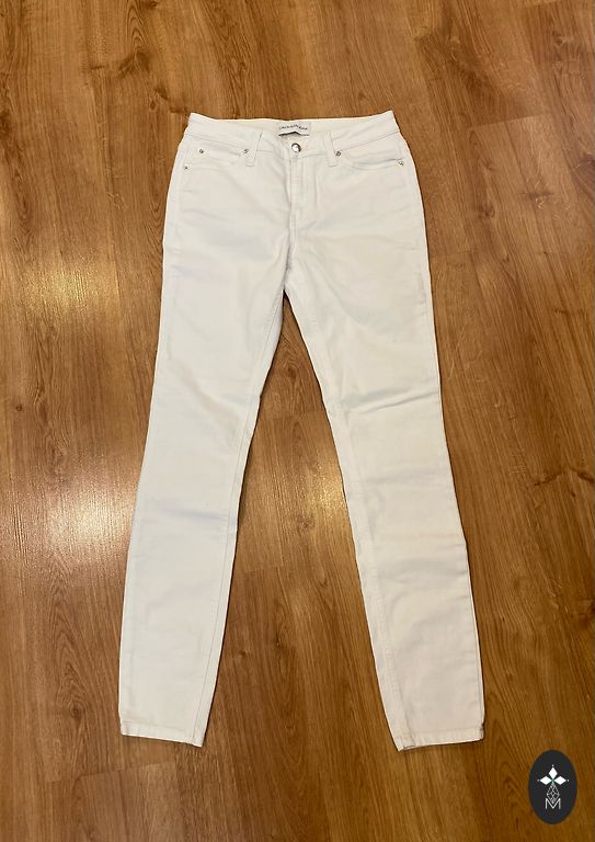 Stilingi balti tiesaus kirpimo džinsai. Švarus, klasikinis modelis – lengvai derinti su palaidinėmis, megztiniais ar švarkais. Idealūs pavasariui ir vasarai.