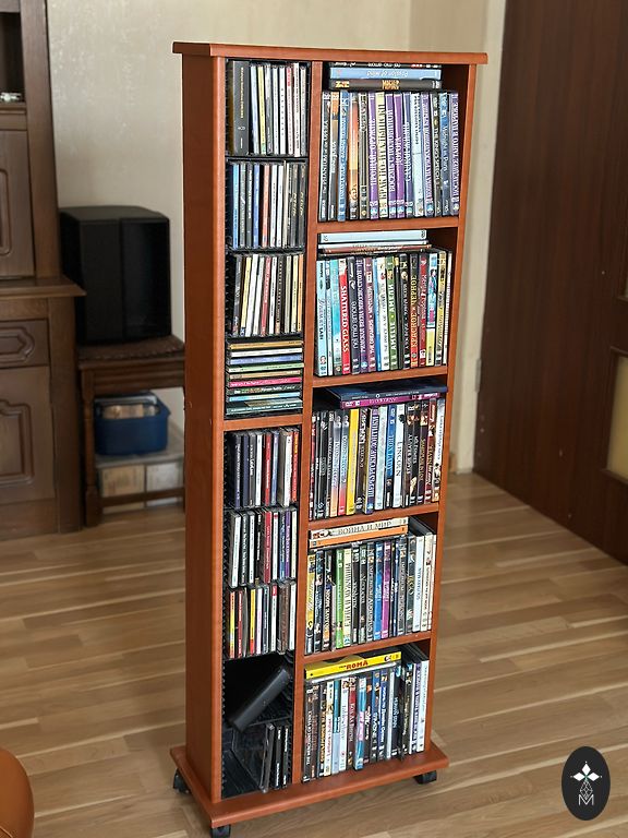 Rotējoša pamatne, no 4 pusēm var salikt kompaktdiskus, kopējā ietilpība 100 gab.