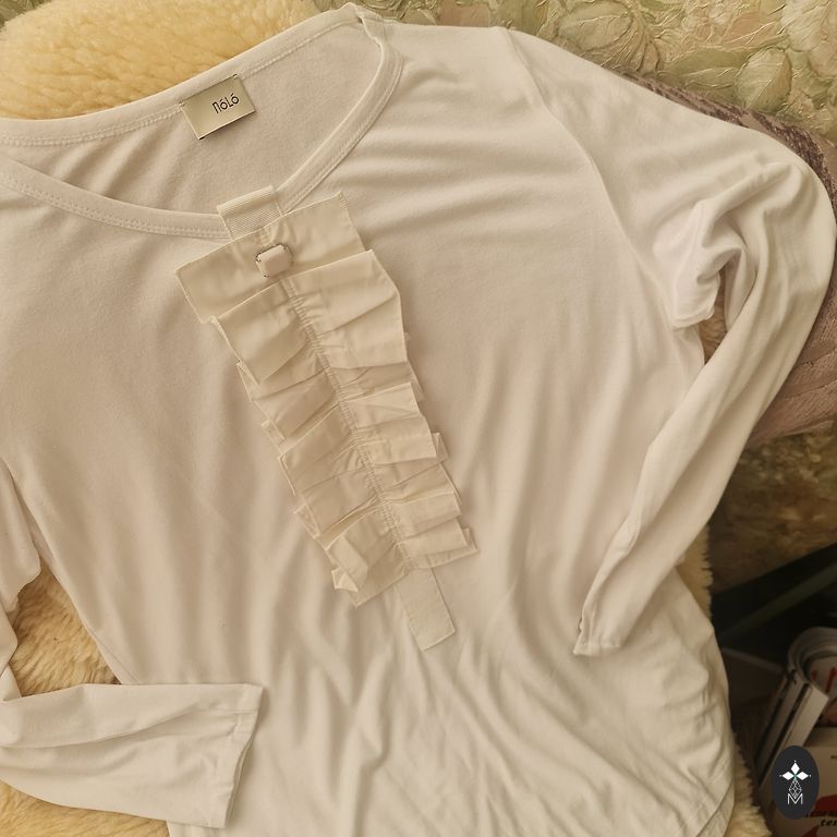 Sobib M/L suurusele, on vooder, sisaldab siidi, õlaosas on tagasihoidlikud kaunistused, pluusil on kerged volangid. Suurepärane koos valgete pükstega. Hind sisaldab saatmist.
