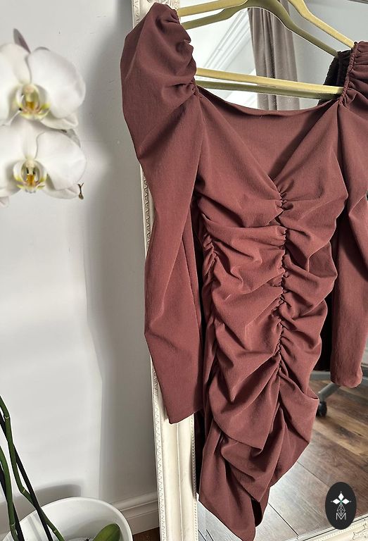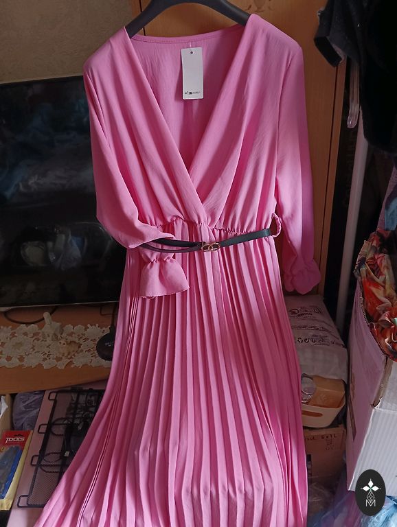 Платье до колен, все вышито блестками. Очень яркое и сияющее.