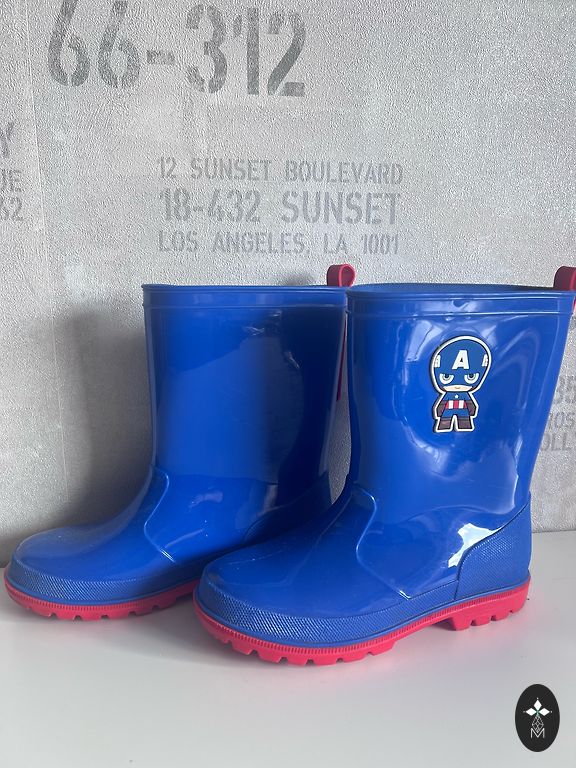 Tumši zili gumijas zābaki. Ražotājs norāda 28./29.izmēru, mērot siltās "zeķes" pēdiņu sanāk apmēram 18 centimetri. Pirkti Rimi, uzvilkti uz apmēram 15 minūtēm (aizgāja un atnāca no dārziņa). Diemžēl jau ir par mazu. No tāda pavisam viegla materiāla (nezinu kā pareizi saucas), nav tāda klasiska smagā gumija. Lieliskā stāvoklī, defektu nav.