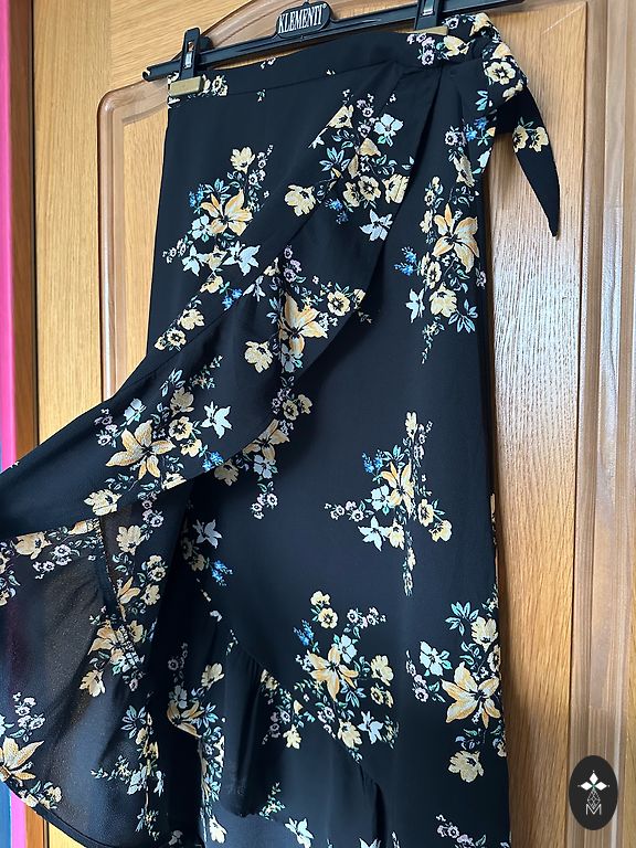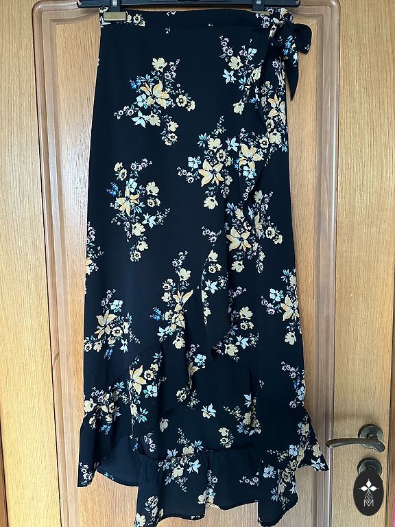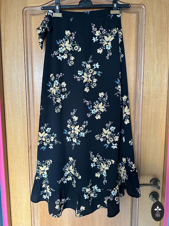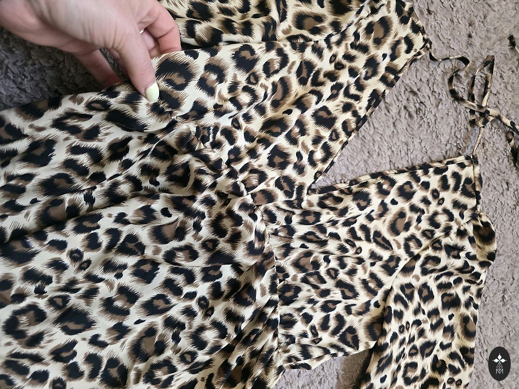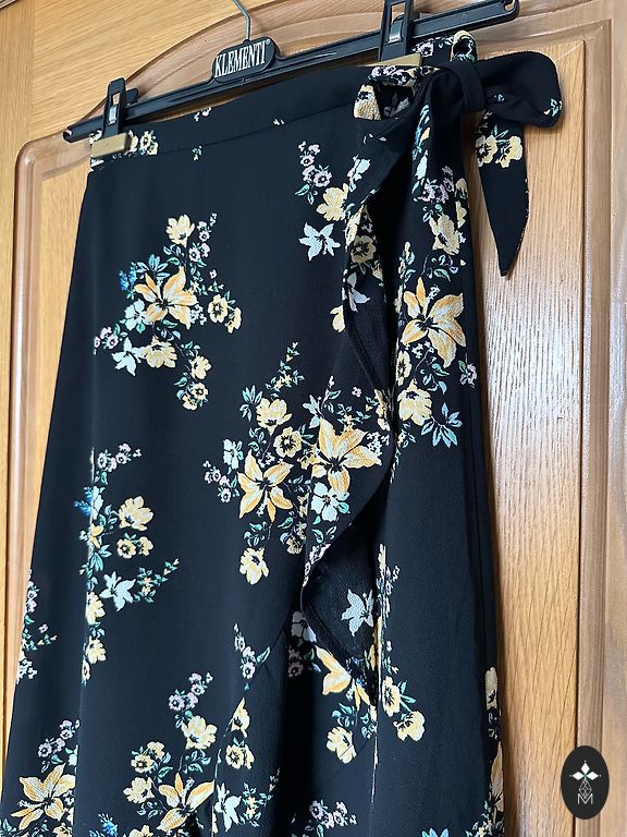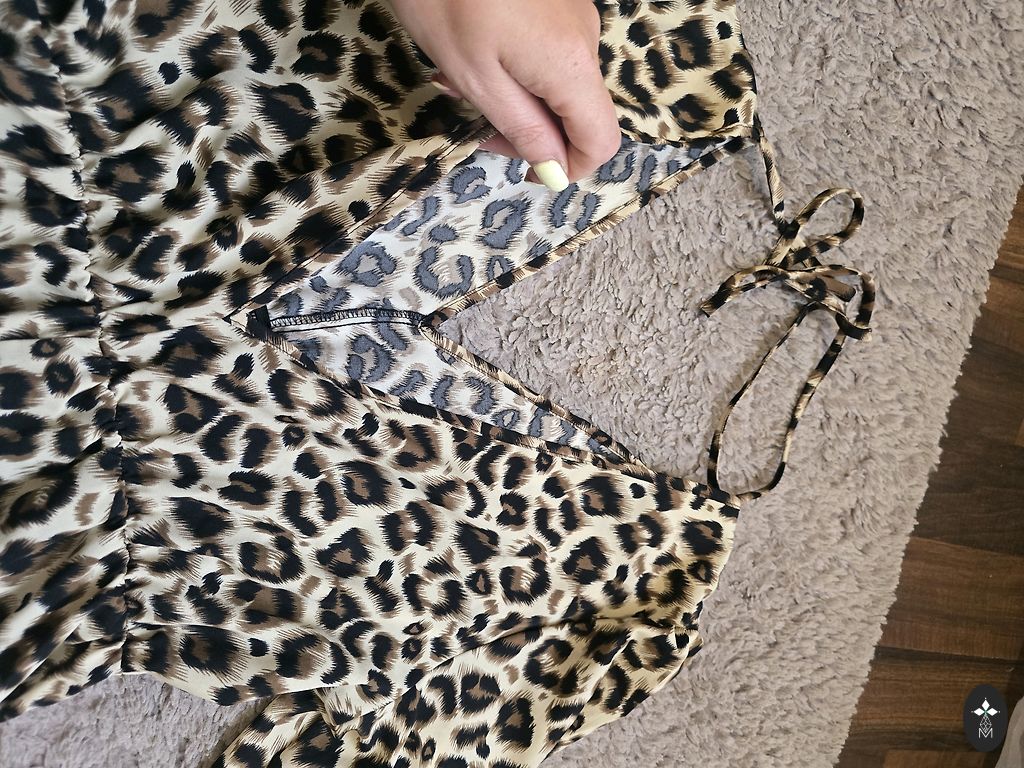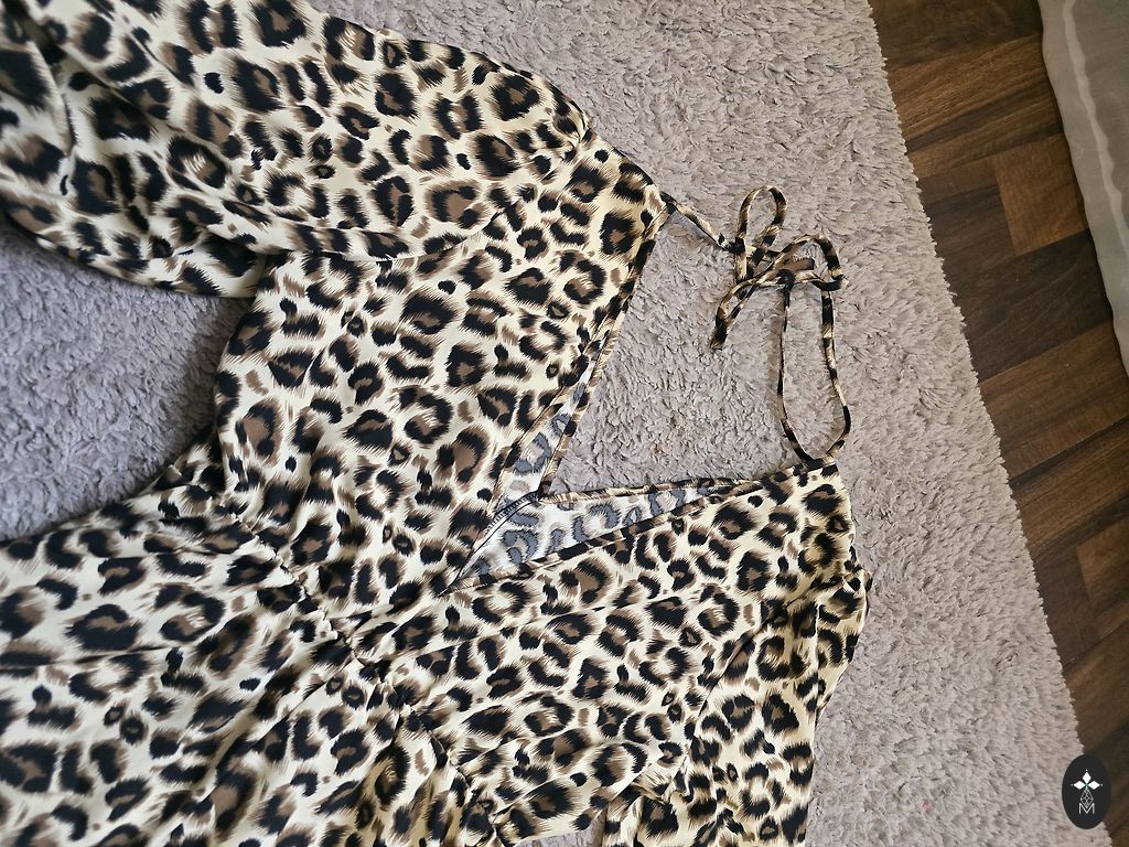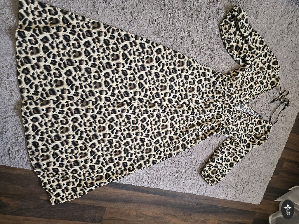 Pikkus - 116 cm, rindkere - 102 cm, puusad - 110 cm. Suurus märgitud - 40. Vöö vabalt ümber talje, külgedel pole silmuseid. Ei ole läbipaistev, kuid kangas on kerge.