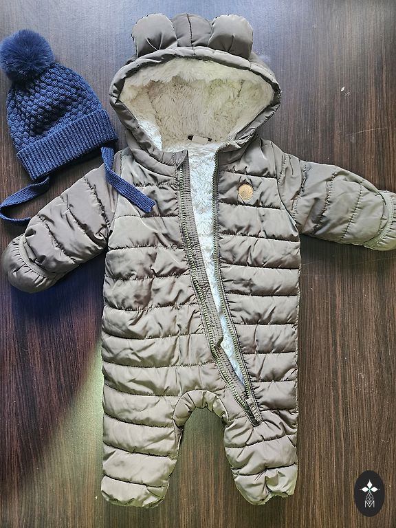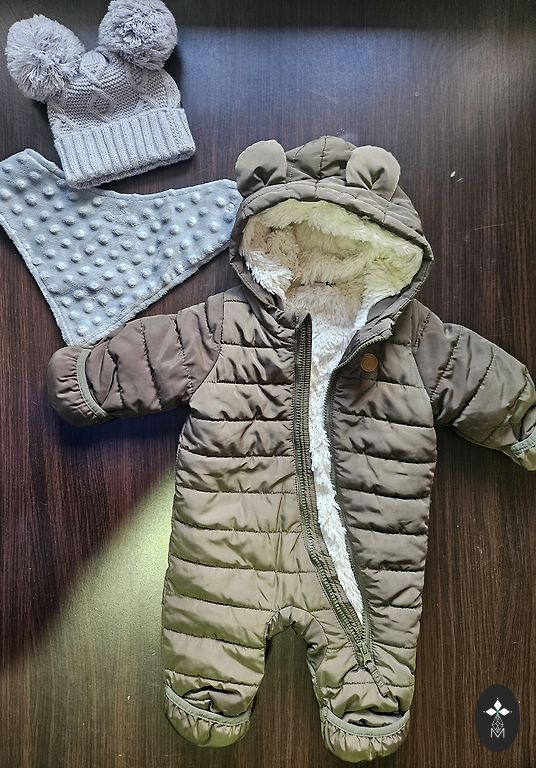 Soe, mugav kombinesoon kõrvaklappidega. Lihtne selga panna. Hele värv - sobib nii poistele kui tüdrukutele. Jalad ja käed on kokkuvolditavad. Jalgade/käte voldikutes on soojustus. Sobib kuni lapse pikkuseni 74 cm, pärast seda istudes tulevad jalad välja (kokkuvolditud kujul).