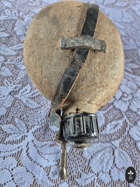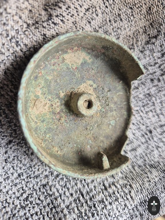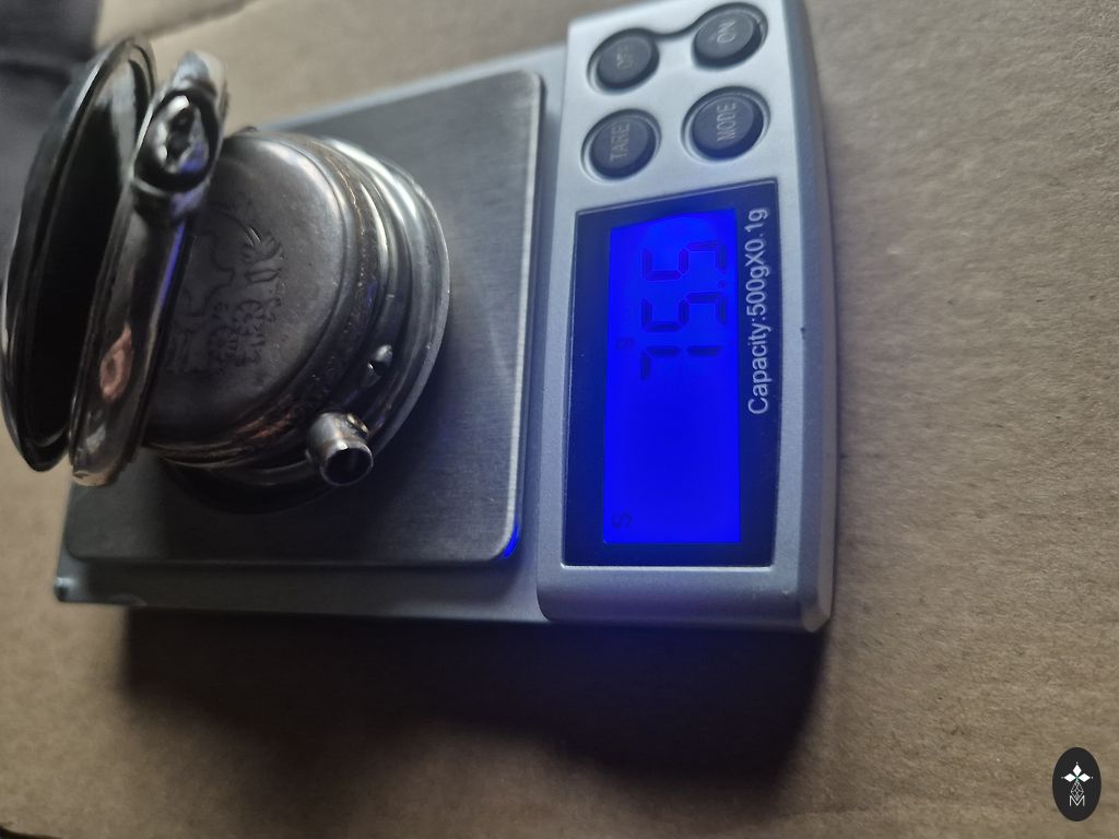 Saktai aizdares kājiņa nolūzusi. Stikla rotājums viducī apbružāts. Sudrabs, 875 prove. Diametrs 5,7cm.