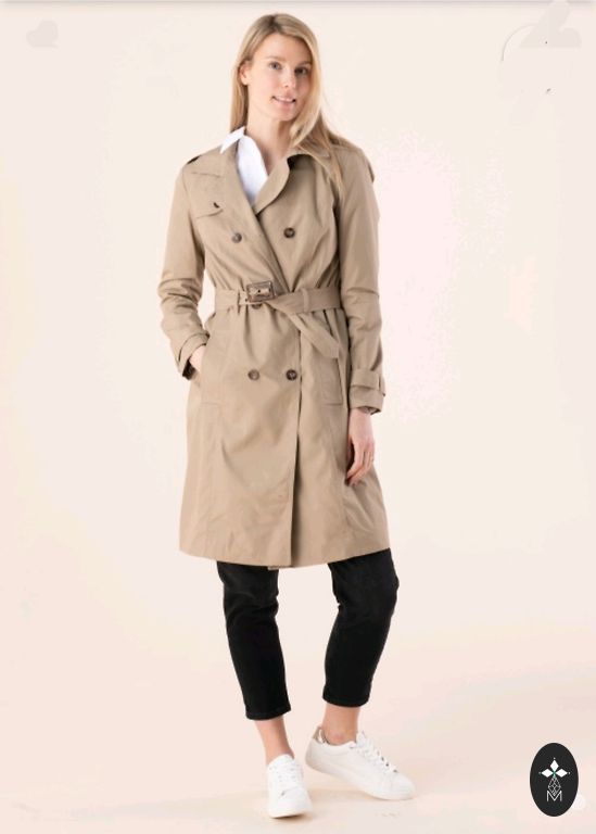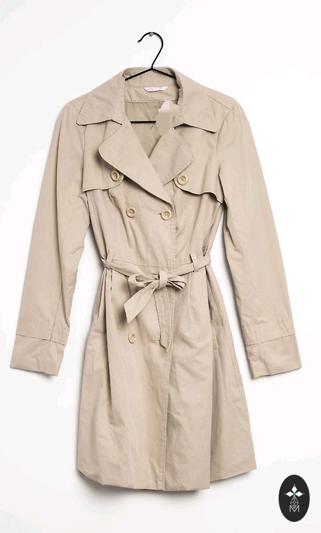 Mazlietots trencis no kokvilnas auduma. Ar jostiņu, bet labi izskatīsies arī bez tās. Bez defektiem. Norādīts izmērs EUR 38 (M). Mēri: mēteļa garums 90 cm, piedurkņu garums 62 cm, plecos 43 cm, apkārtmērs krūtīs 98 cm, viduklī 94 cm, gurnos 106 cm.