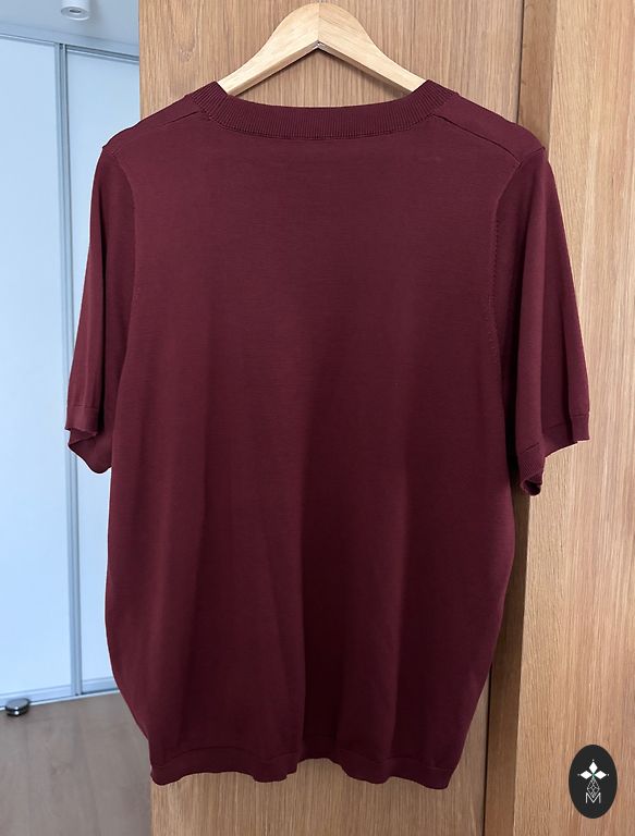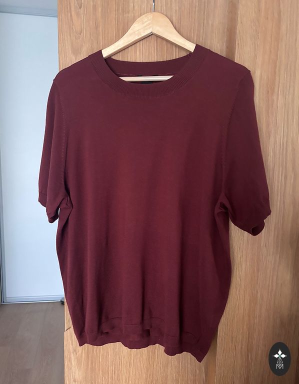 Megztinis trumpomis rankovėmis, būklė nauja, nė karto nevilkėtas, tik nuimtos etiketės, krūtinės plotis nuo pažasties iki pažasties neištemptoje būsenoje 60 cm, ilgis 69 cm.