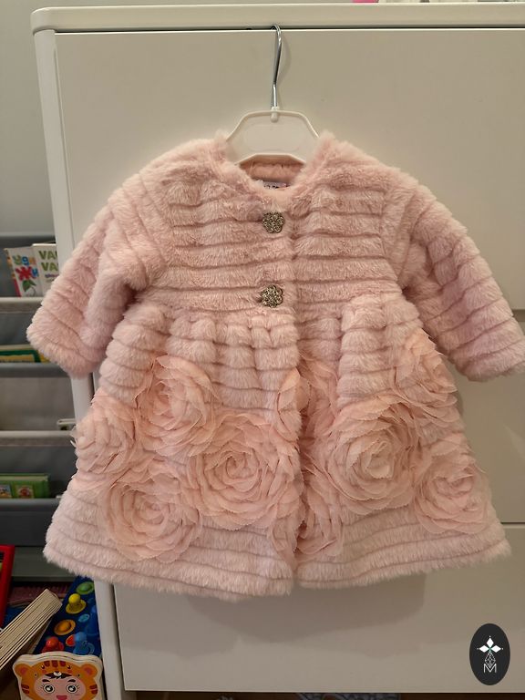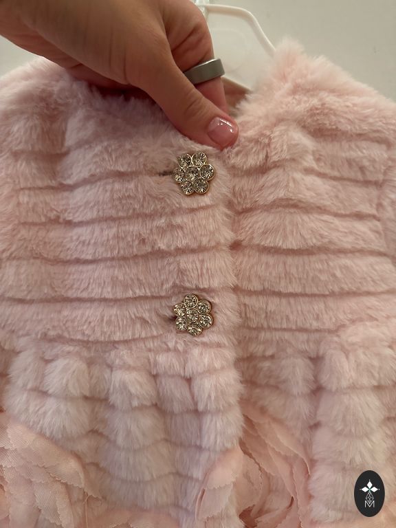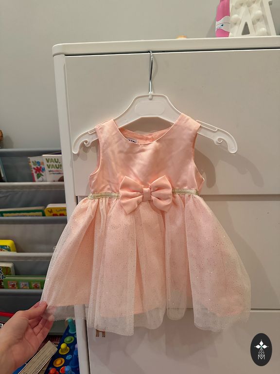 Šifona kleita ar kokvilnas oderi. Uzvilkta tikai dažas reizes. Komplektā ir plāna bronzas josta. Galvenais printējums ir neuzkrītošs gepards ar ziediem. Garums 79 cm. Plecos 29 cm, krūtīs 35 cm, piedurknes garums 57 cm, piedurkņu galos ir iešūtas gumijas.
