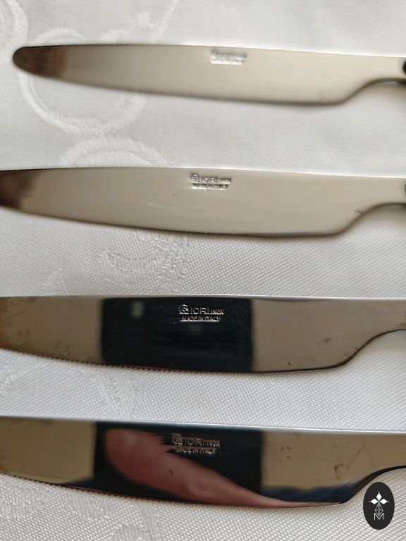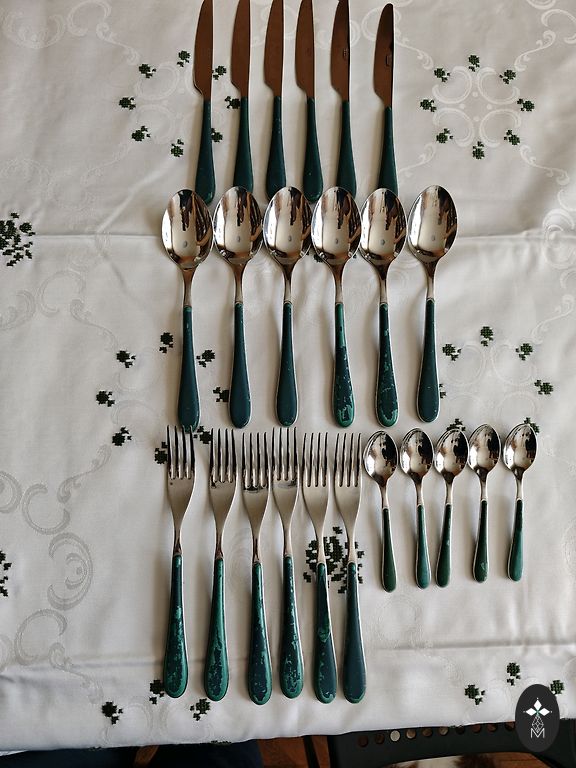 Senoviniai stalo įrankiai „Bambuko lazda“. Bronzos ir nikelio lydinys. Daugiau nei 100 daiktų. Yra patina. Reikia valymo. Kaina 200€.