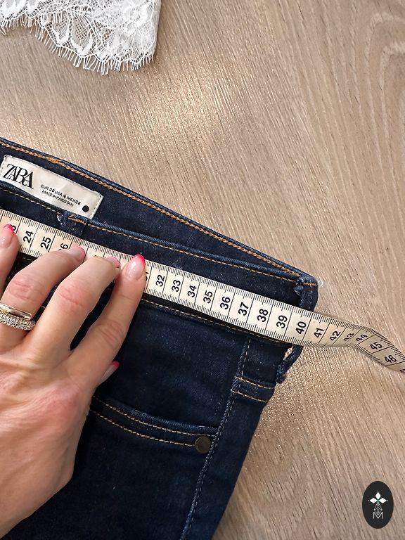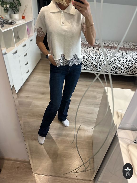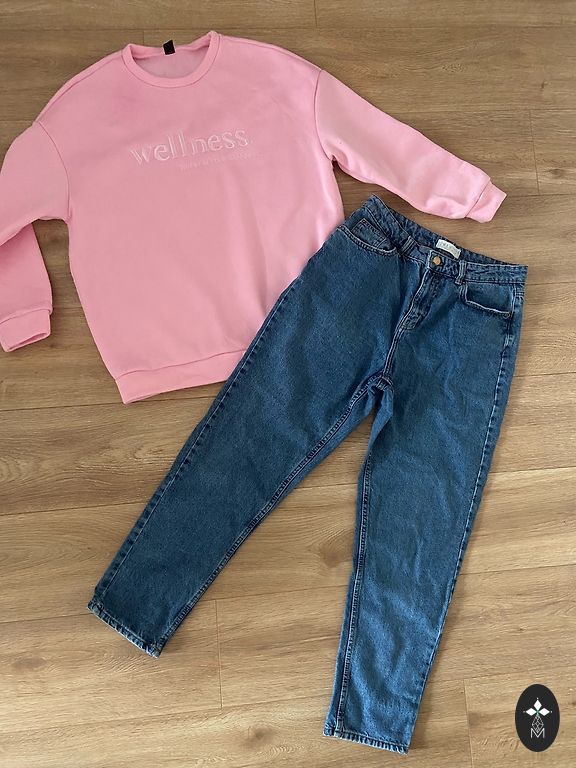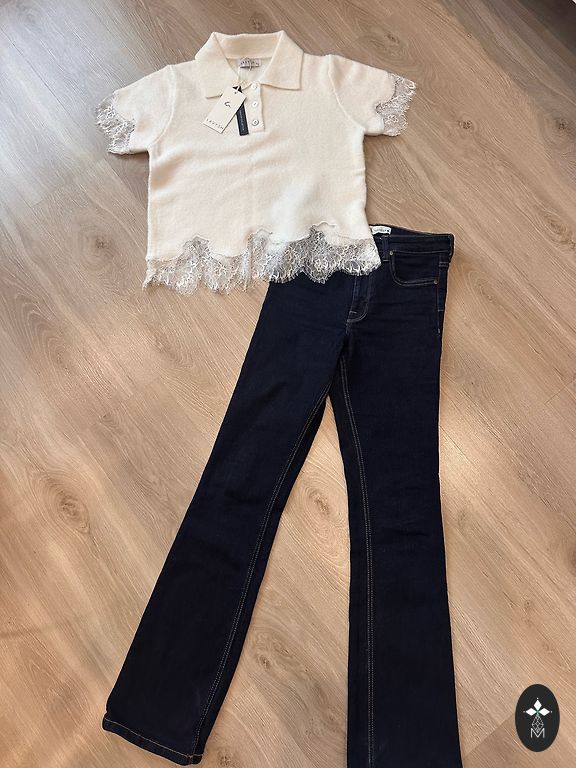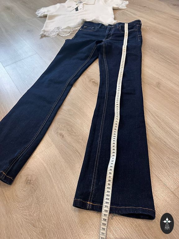 Zilajiem džinsiem un raibajai blūzīte dzeltenīgs traips. Citu trūkumu nav. Nedalu.