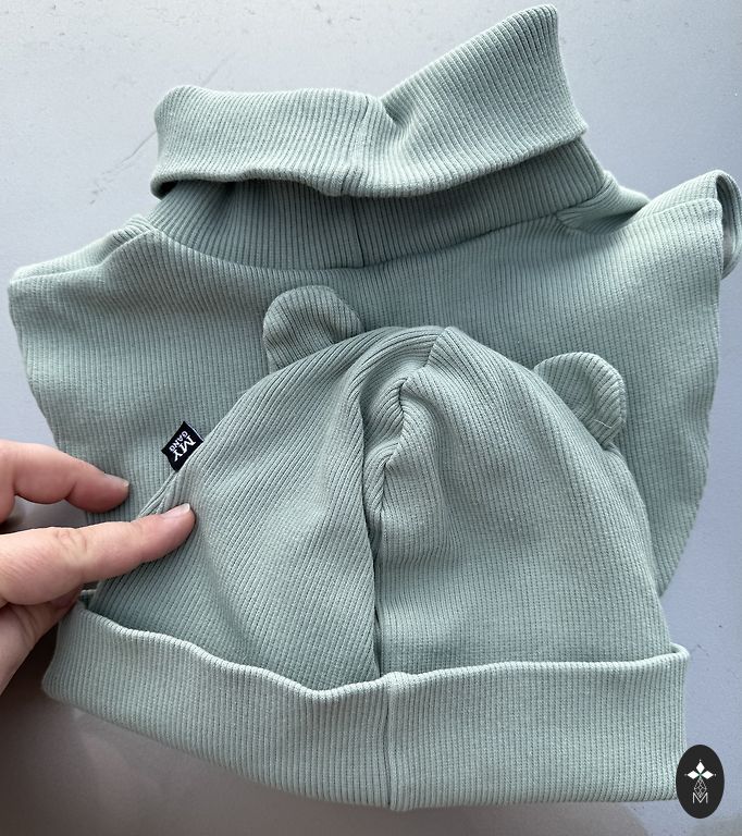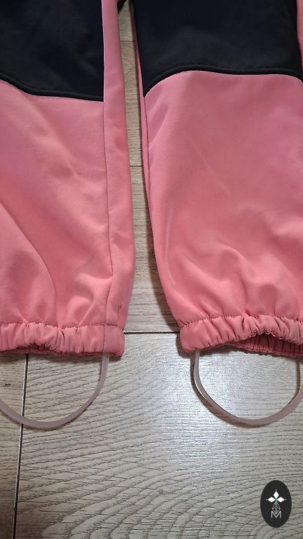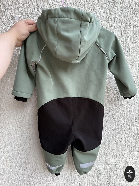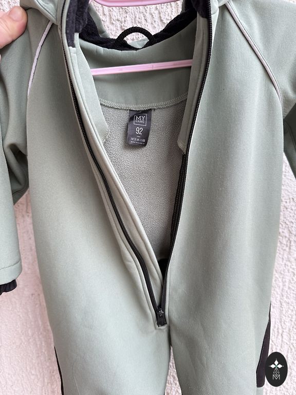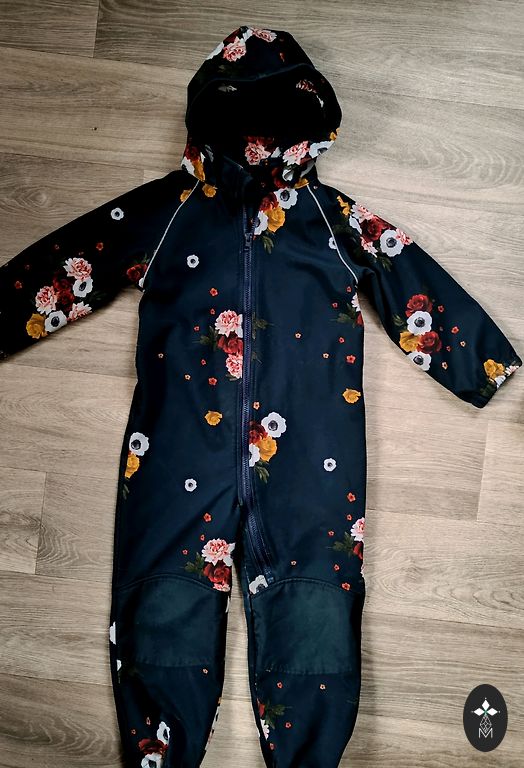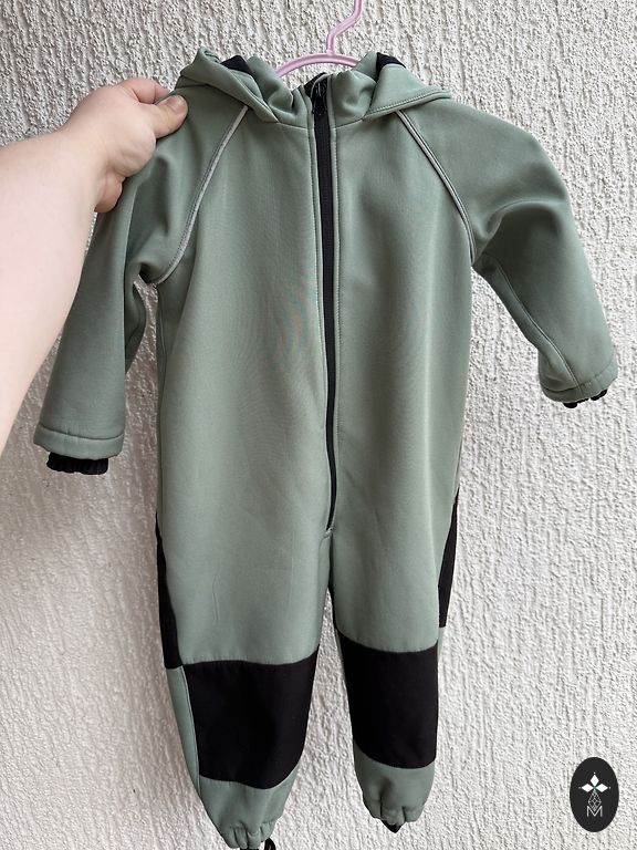 Size 110, softshell jumpsuit. In the last picture, see - there was a tear along the seam, sewn up. The bottom and knees are all good. Length 94cm, inseam 47cm.