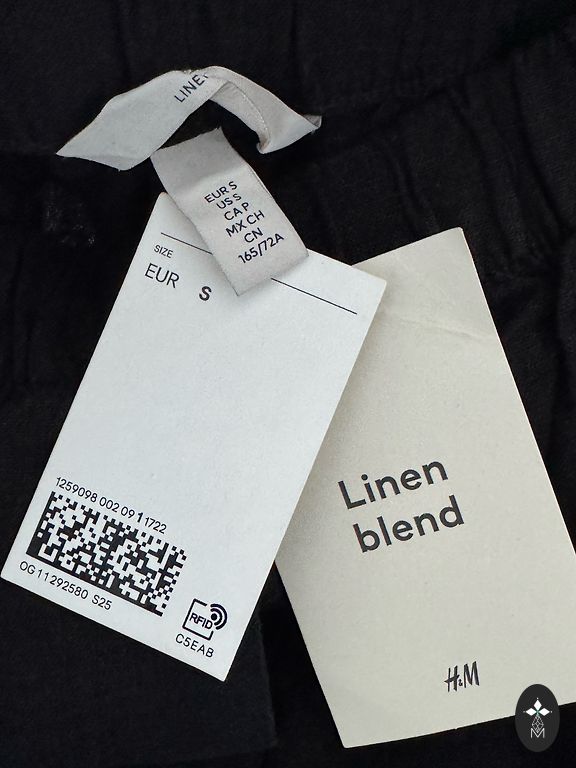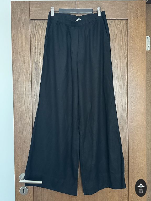 Uz S-M izmēru, 55% lins un 45% kokvilna, viduklis 78 cm, gurnos 98 cm un garums 103 cm, var izveidot kā kapri.