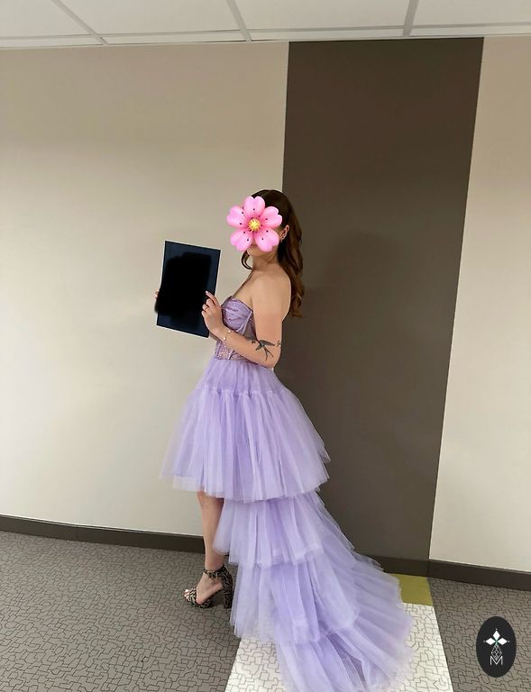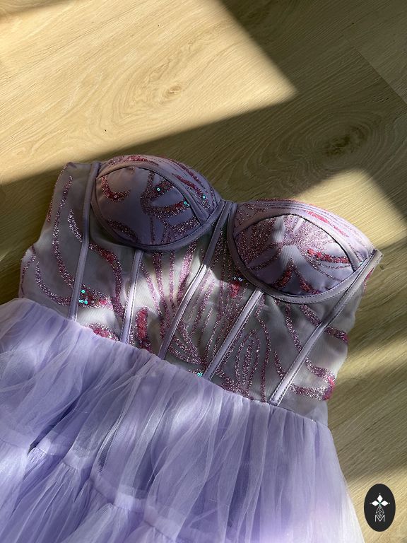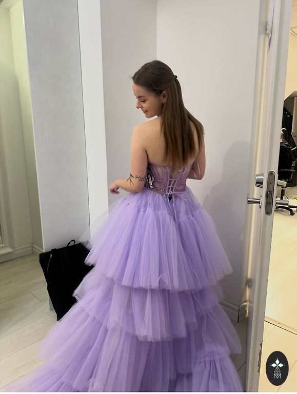 Eleganti violetinė išleistuvių suknelė puikios būklės. Suknelė dėvėta tik vieną kartą per išleistuves. Labai graži ir ryški spalva, puikiai išsiskirianti tiek dienos šviesoje, tiek vakaro apšvietime. Patogi, lengva ir malonaus audinio, gražiai krintanti ir išryškinanti figūrą.