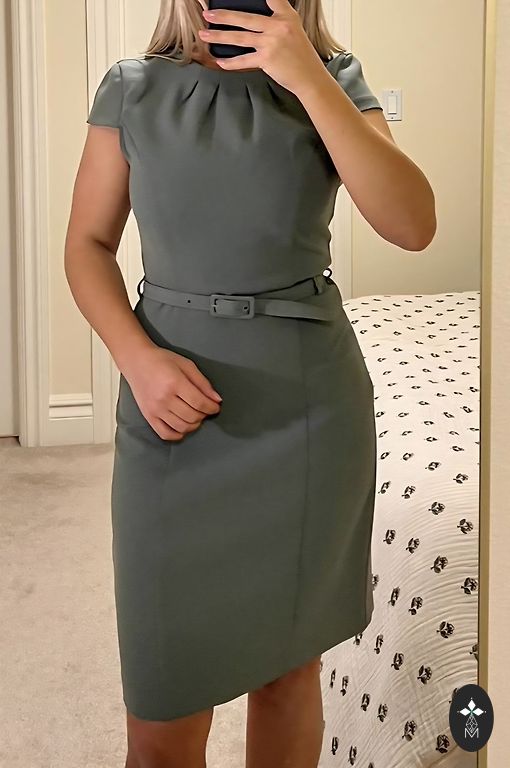 Klasikinė, elegantiška žalsvai pilka suknelė su gražiu dirželiu. Matote nurodytą dydį nuotraukoje - po pažastimis apie 47 cm, ilgis nuo peties apie 95 cm. Nugaroje užtrauktukas, išsitempia labai toli. Mažas skeltukas, kuris dar net nėra atardytas. Dėvėta vieną kartą ir išskalbta. Puikios būklės!