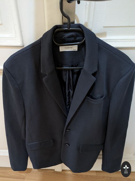 Suit worn twice, bought for 9th grade graduation. Composition: 80% wool, 18% viscose, 2% lycra. Size 46. Jacket shoulders 45cm, chest circumference 90cm, sleeve length 63cm, jacket length 73cm. Pants length 97cm, waist circumference 78cm, hips 100cm.