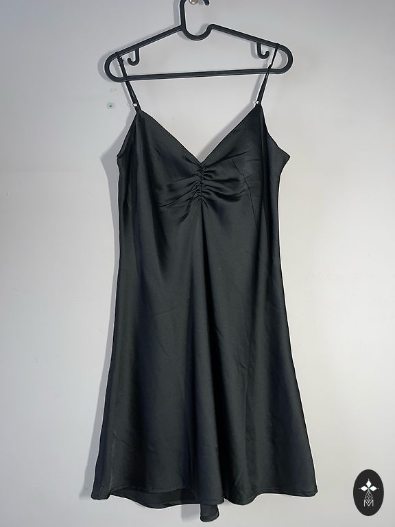 Kleita ar tumši zilām un baltām svītrām. S izmērs, garums nedaudz virs ceļa (atkarībā no auguma). Aizmugurē rāvējslēdzējs, uz pleca sudraba podziņas. Par sūtīšanu maksā pats.