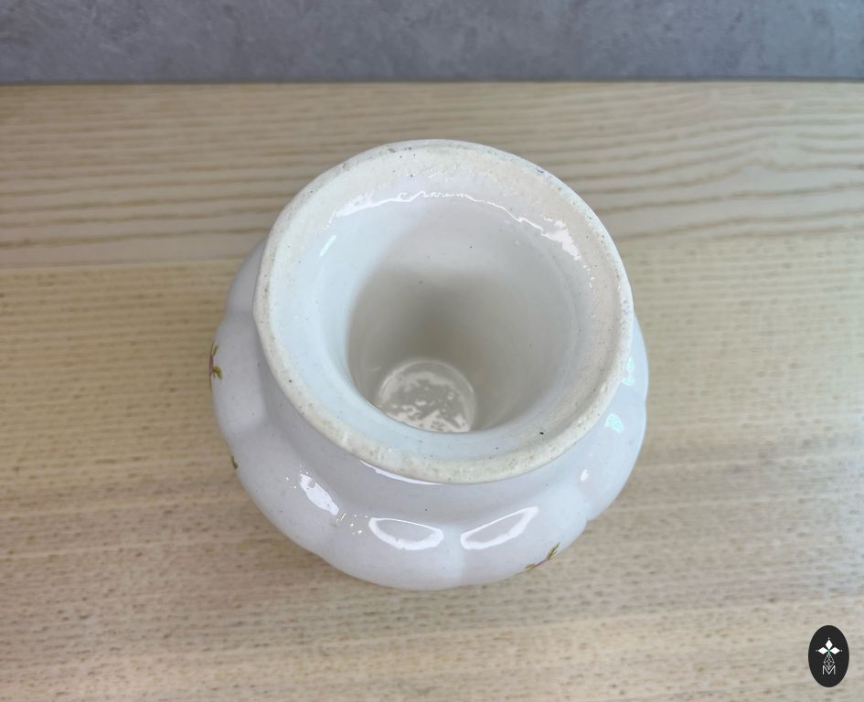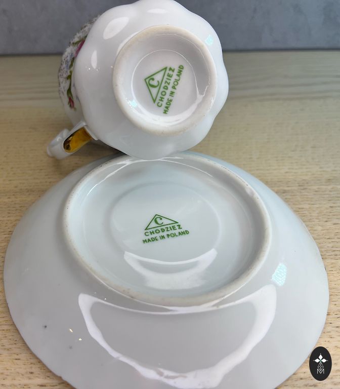 Limoges porcelāna sagatave, dekorēta Parīzē tirdzniecības namā Aux Lions de Faïence (Rue de Rivoli). Dekorācija veikta tradicionālā tehnikā, kas raksturīga XIX–XX gadsimta mijai: galvenais ornaments — dekols, ar manuālu ziedu elementu piezīmēšanu un manuālu apzeltīšanu pa malu un rokturi.