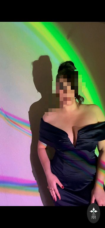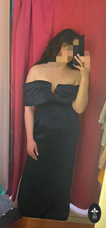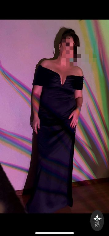 Длинное темно-синее платье. С открытой спиной, разрез спереди.