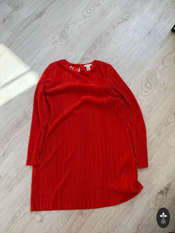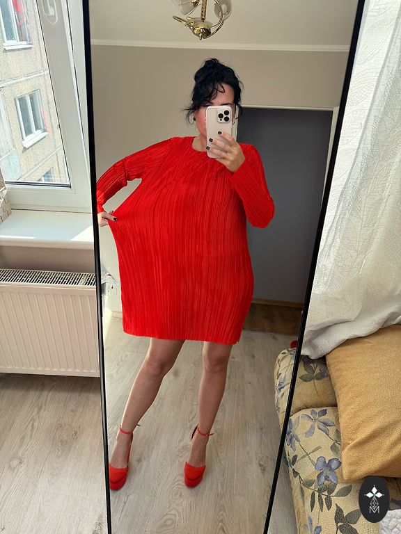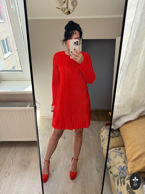 Eleganta taisna piegriezuma kleita,ar oderi,piedurknes ar vieglu paplatinājumu,klasisks apaļš kakla izgriezums,spilgti sarkana.