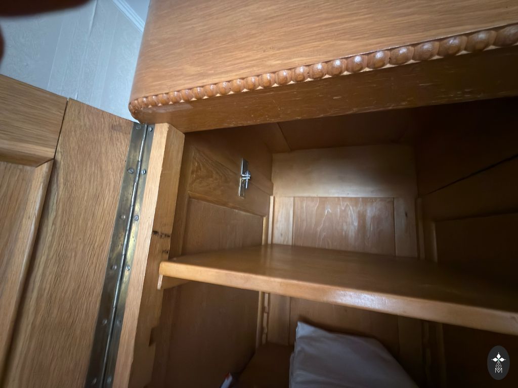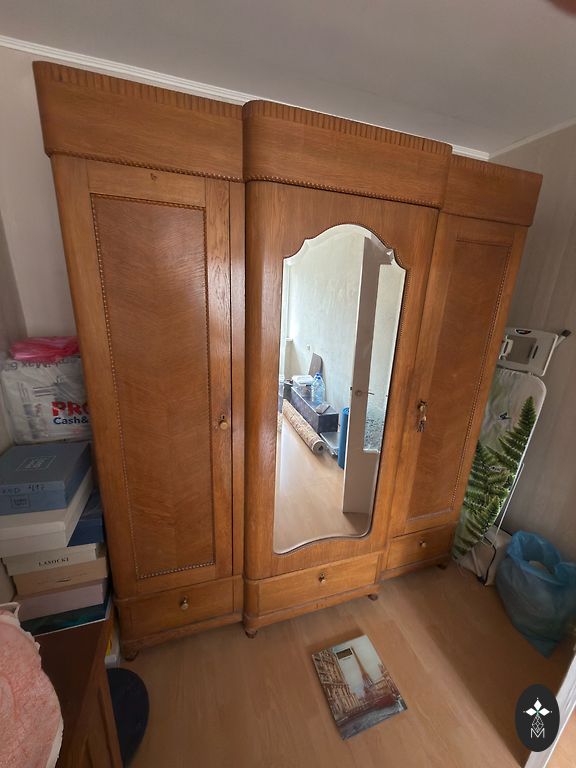 IKEA skapis ar dažiem defektiem, plauktiem un arī cauruli, ko var iekārt iekšpusē, apakšā ir viena atvilktne, kas atveras.