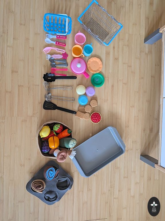 5. Līdzi dažādi virtuves piederumi (karotes, dakšas, naži), un mazi māla/porcelāna/plastmasas trauciņi.