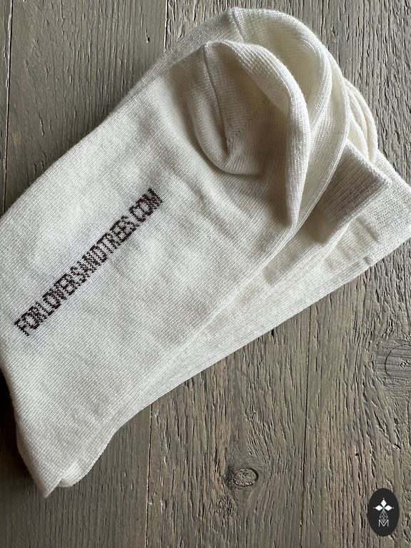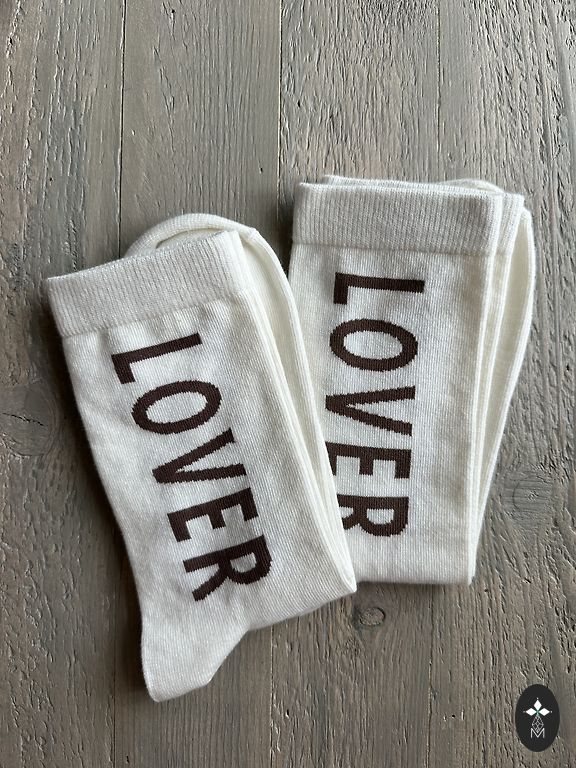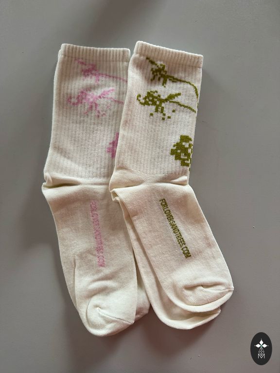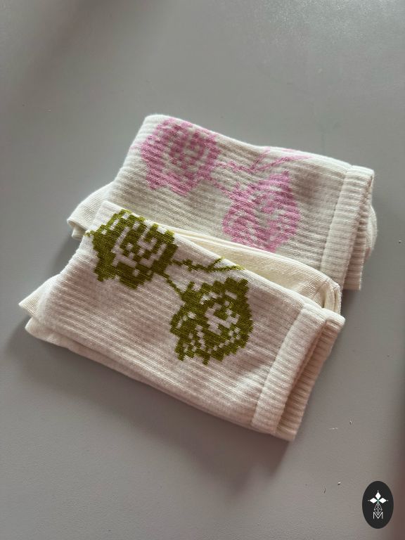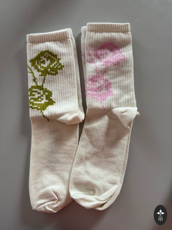 Soft pink socks with black writing on them.
