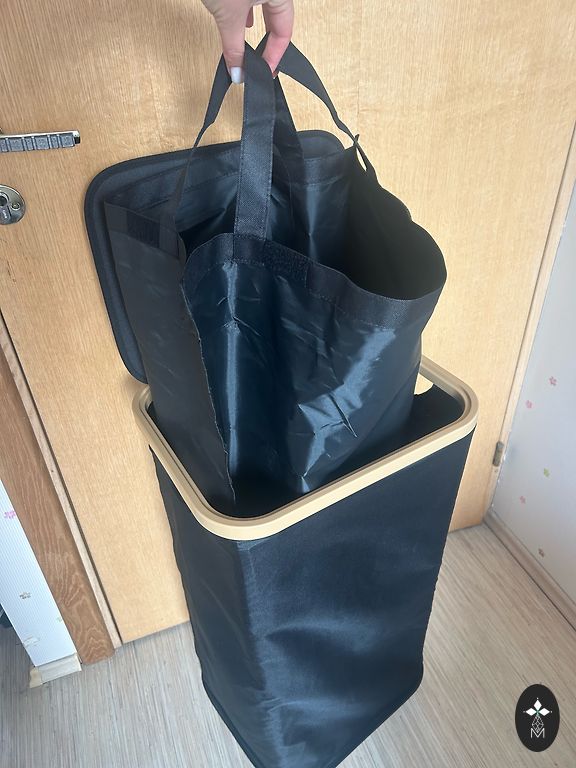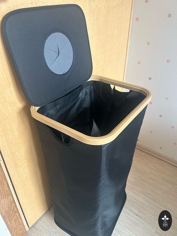 Miskastei ir ar kāju atverams vāks, vākam soft close aizvēršana un izņemams spainis.