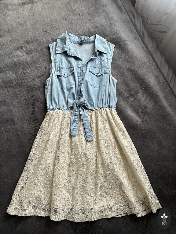 Vasarīga kleita ar baltu oderi un gaisīgu likras sietiņa virskārtu; ziedu prints gaiši violetos un rozā toņos. Elastīgs. M izmērs. Garums ~ 95cm.