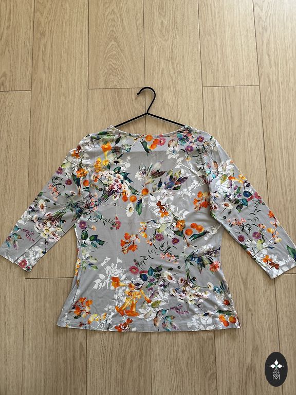 Zila kleita ar baltu neuzkrītošu rakstu, viegla. ESPRIT. 44 izmērs. Garums apmēram 1 m. Piedurknes ¾. Priekšā 3 slēptas podziņas un nošuves. Svārku daļā – odere. Ar auduma jostiņu.