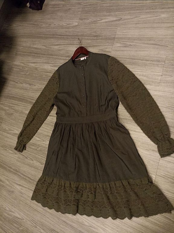 Comfortable everyday dress, non-iron, slightly stretchy fabric. Split in front. Buttons can be buttoned up as much as you like. Waist tie. Length 113 cm, chest 49 cm
