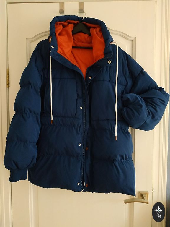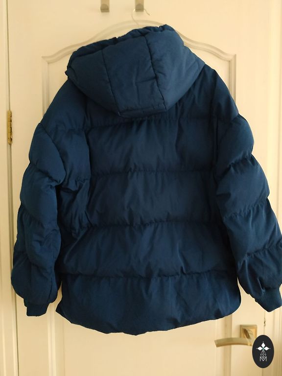Moteriška pūkinė striukė. Ilgis 69-70 cm, rankovė 61-62 cm, didelis apykaklė.