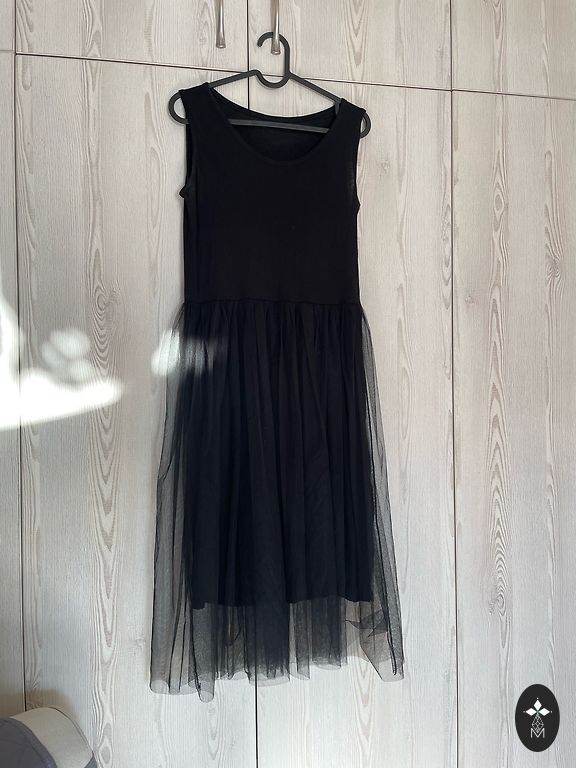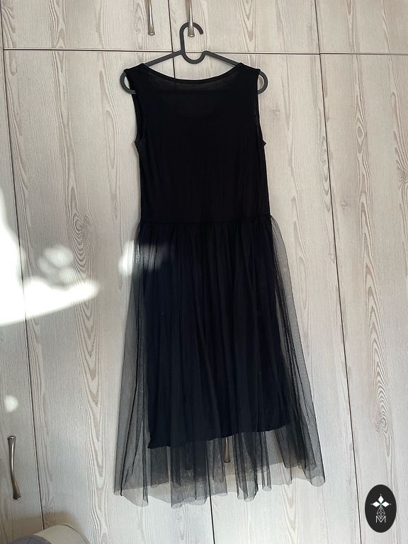 The material has some sparkles, underskirt, size 46, length 106, bust 53, waist 48, zipper on the side.