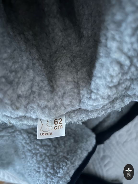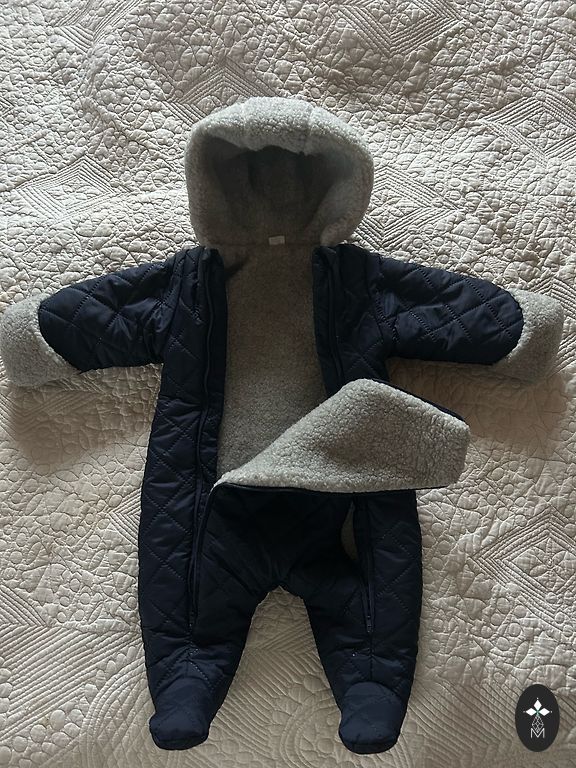 Žavus pirmasis kūdikio kombinezonas. Puikios būklės, be jokių defektų. Priekyje yra dvi užtrauktukų, kad būtų lengviau išimti/įdėti kūdikį. Susukami rankovės. Nuimamas gobtuvas su spaustukais. Jei reikia siųsti paštu, pridedamas pašto mokestis.