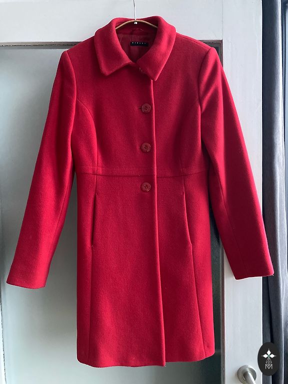 Vanusele 6, pikkus 116 cm. Sellel on 2 taskut ja nööpkinnitus. Koostis: 50% vill, 50% polüester. Sellel on soe tumekuldne vooder.