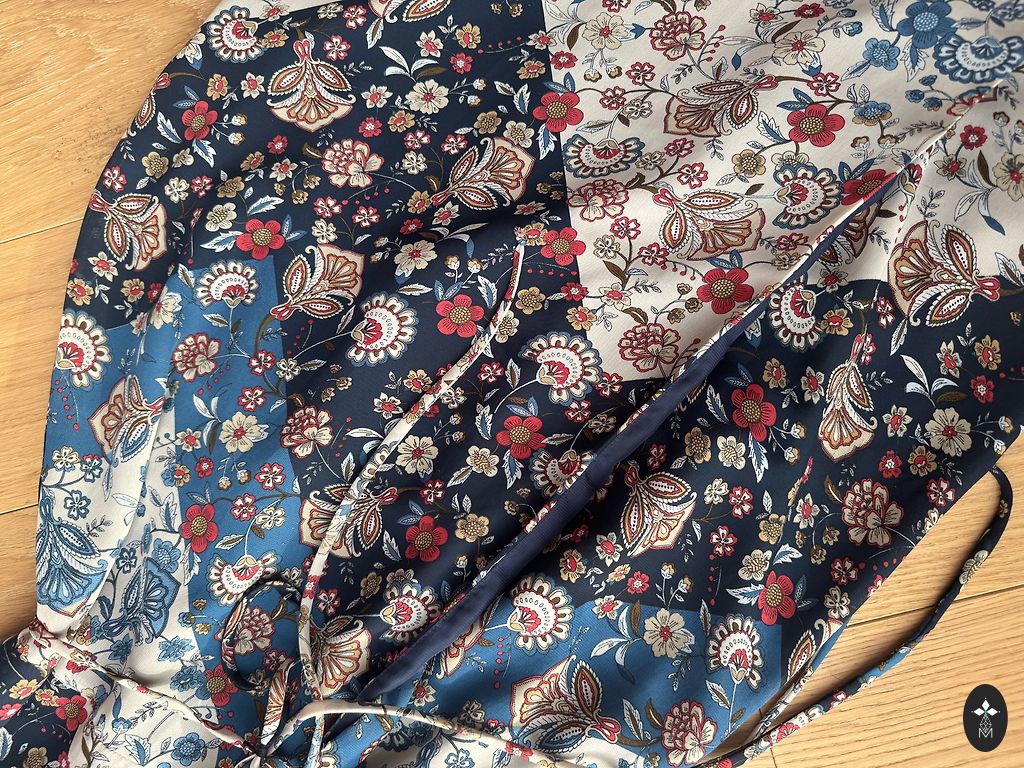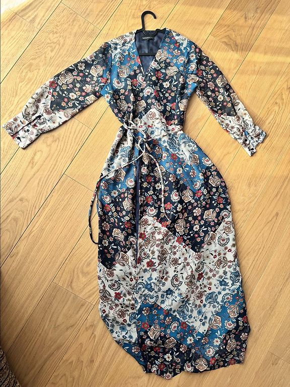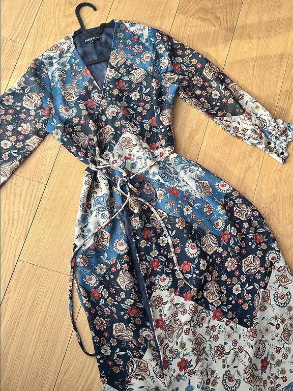Kerge, siidine VILA kleit mustriga. Kleidil puudub alusseelik, kuid läbi ei paista. Tagaküljel kaelal nööbikinnitus. Suurus märgitud EUR36, S. Pikkus 95 cm, rindkere 47 cm, talje 44 cm. Materjal ei veni. Kleit on veatu.