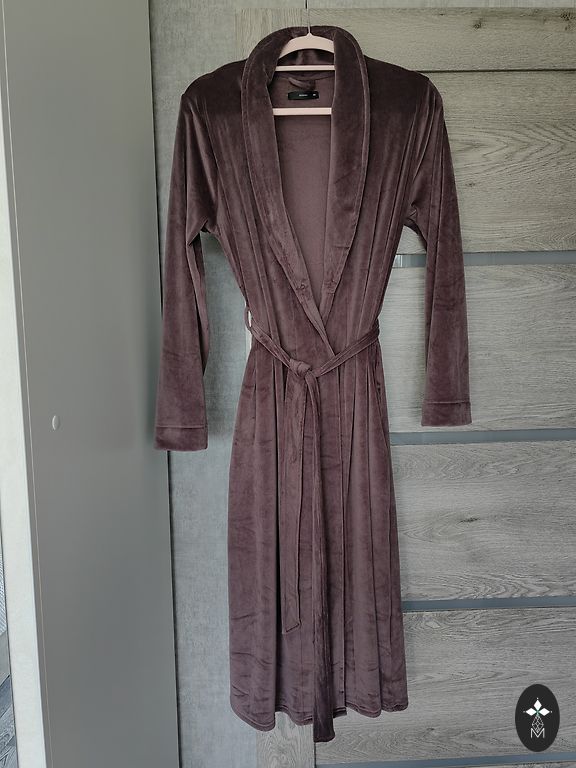 Naujas, minkštas ir patogus chalatas su užtrauktuku ir diržu, tamsiai mėlynos spalvos, ilgis 125 cm. Dydis S taip pat tiks mažam M (UK 34/36).