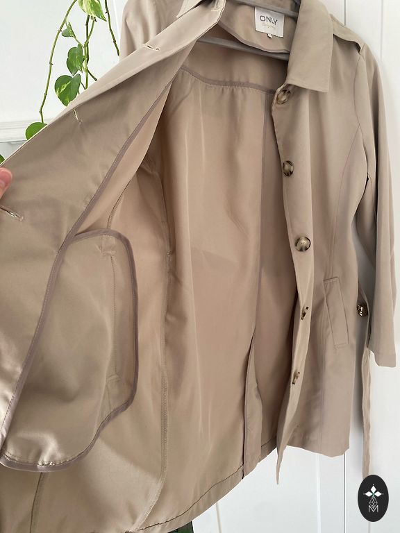 Atrodo labai brangiai ir stilingai, tinka tiek sportiniam stiliui, tiek moteriškesniam - universalus variantas. Panašaus tipo paltą (tačiau tiksliai tokio tiesiog nėra) galima rasti, jei kaina yra nuo 170 iki 300. Oversize stilius, bet idealiai tinka S - M. Paltas šeriuotas, plonas, be pamušalo. Uždarymas - sagos. Yra kišenės. Spalva rausvai - smėlio. Labai stilingas. Tinka pavasario - rudens sezonui ir šaltam vasaros orui. Buvo pirktas brangiai - už 175 (kaina nesvarstoma).