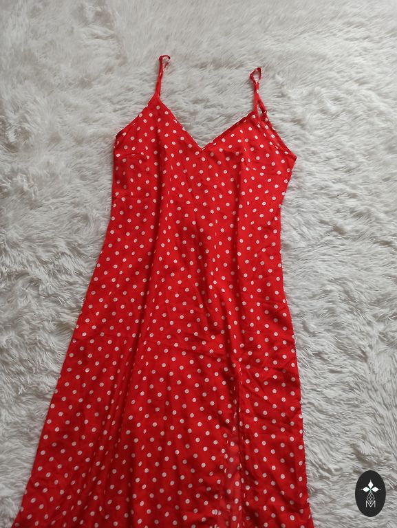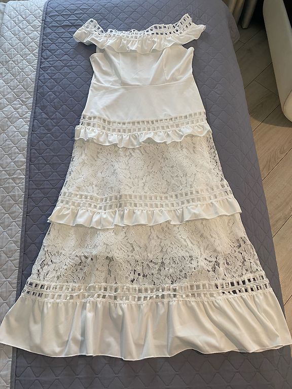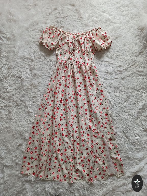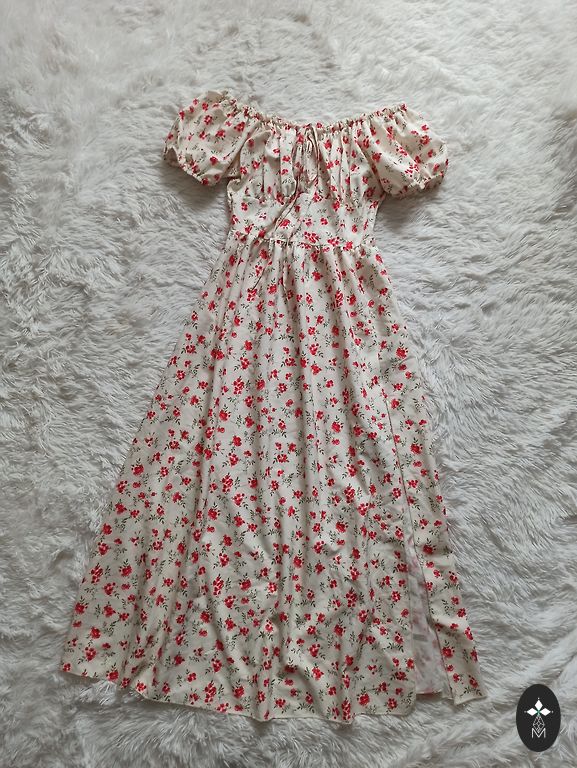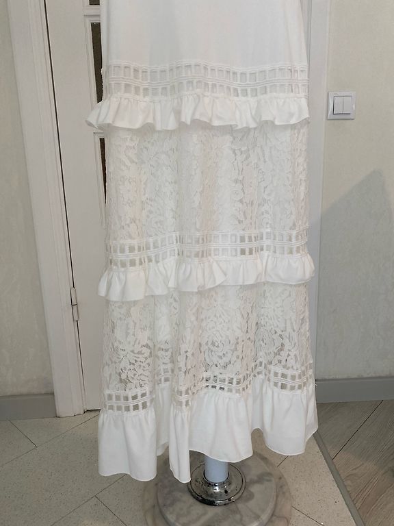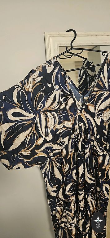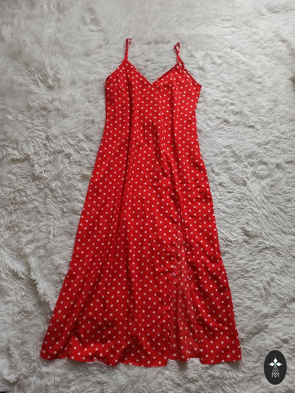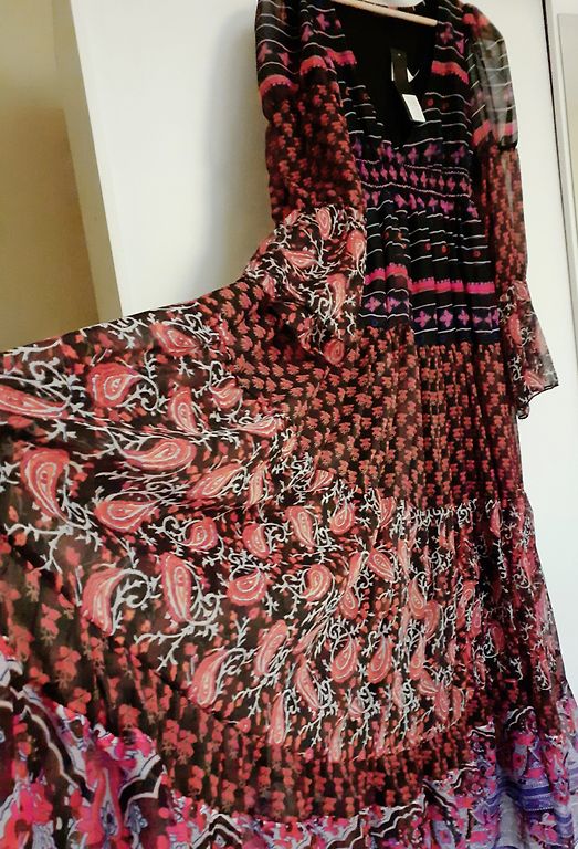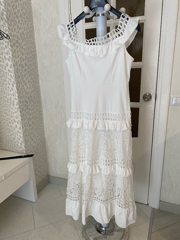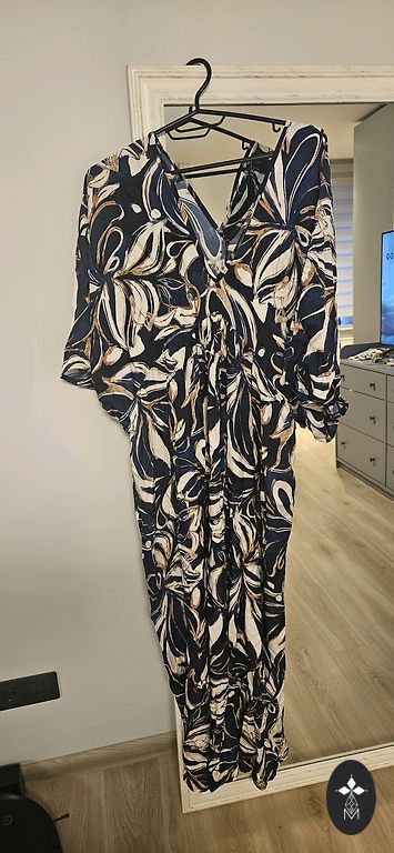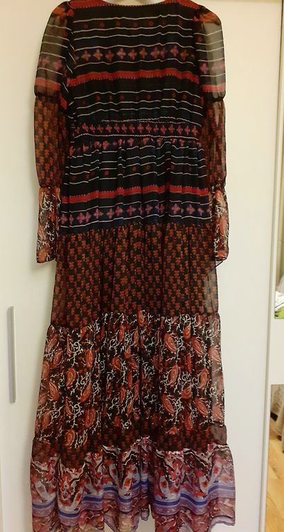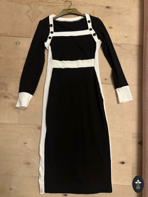 Uus, just mõõdetud, kahjuks minu jaoks veidi liiga väike. Väga ilus, pikk kleit kuldsete nööpidega. Komplektis on vöö. Fotol olev modell kannab sama kleiti teises värvitoonis.