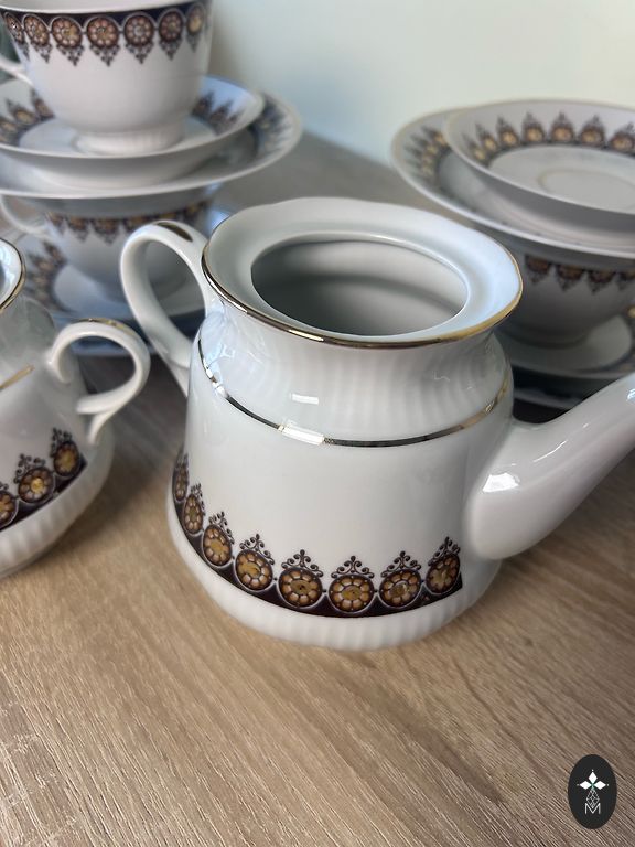 Kavos puodelis su tamsiai rudomis kavos pupelėmis ir auksu.